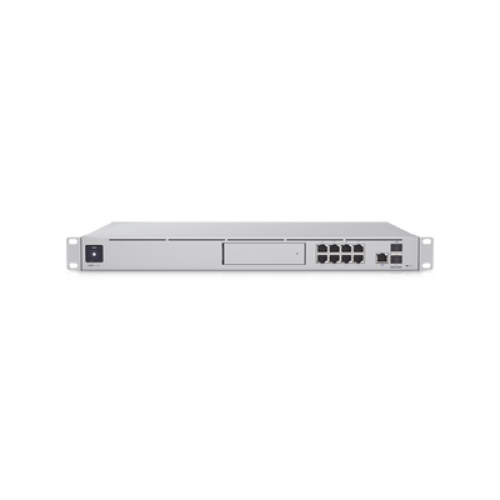 Cloud Gateway 10G con doble WAN, switch PoE integrado y NVR, con soporte para 100+ dispositivos UniFi, 1,000+ clientes simultáneos y rendimiento IDS/IPS de 3.5 Gbps.