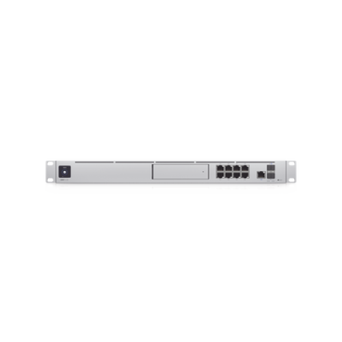 Cloud Gateway 10G con doble WAN, switch PoE integrado y NVR, con soporte para 100+ dispositivos UniFi, 1,000+ clientes simultáneos y rendimiento IDS/IPS de 3.5 Gbps.