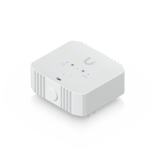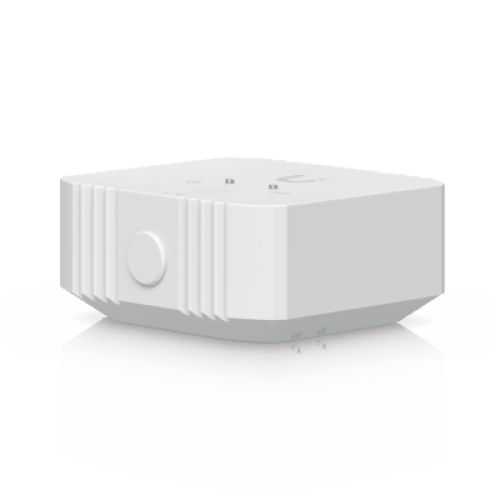 Sensor ambiental con conectividad SuperLink, capaz de medir temperatura, humedad, luz ambiental y presencia de agua, con alcance de hasta 2 km e integración con UniFi Protect.