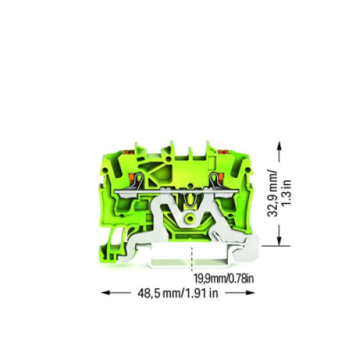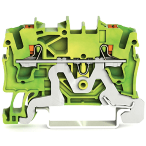 Borna de Tierra TOPJOB® S / 2 Conductores / Sección 2.5 mm² / Tecnología Push-in CAGE CLAMP® / Operación con Tecla / Montaje Carril DIN 35x15 y 35x7.5 / Color Verde-Amarillo / Aplicaciones Ex y Ferroviarias / Certificacio