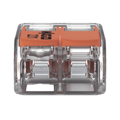 Borna de Conexión / Serie 221 / Palancas Naranja / 2 Conductores 4 mm² / Carcasa Transparente / 300V 20A / T85 / UL ENEC Certificado