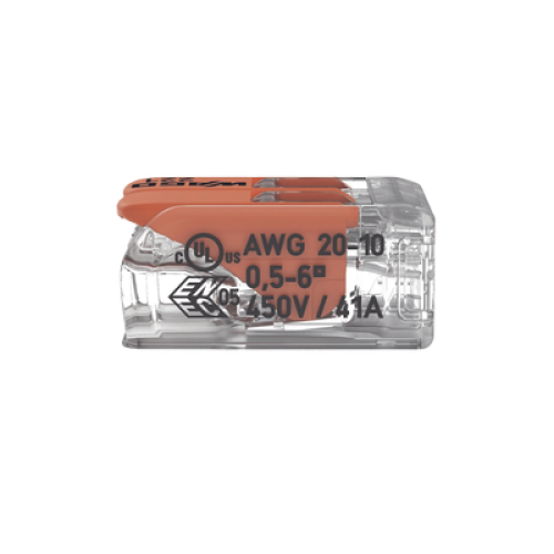 Bornes de conexión con palancas de la Serie 221 diseñados para conexiones eléctricas rápidas y seguras. Utiliza tecnología CAGE CLAMP® que permite la conexión de todos los tipos de conductores (rígidos, semirrígidos y flexibles) con secciones desde 0.5 hasta 6 mm². Ideal para instalaciones eléctricas profesionales en cajas de derivación, sistemas de iluminación de baja tensión y distribución de cableado en aplicaciones residenciales e industriales. Cumple con normativas internacionales incluyendo EN 60998, UL 486C y certificaciones marinas ABS, DNV GL y LR.