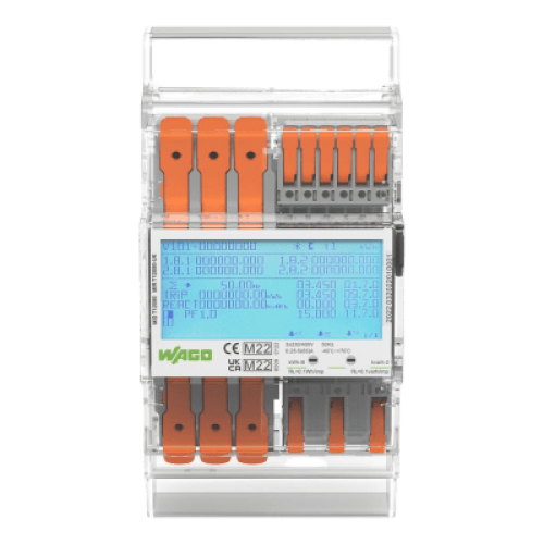 Contador de consumo energético MIDI certificado para medición directa de energía activa y reactiva en redes trifásicas. Equipado con tecnología Push-in CAGE CLAMP® con palanca para conexiones rápidas y seguras. Ofrece interfaces de comunicación Modbus y M-Bus, además de doble interfaz S0 para salida de pulsos. Display LCD iluminado para visualización completa de parámetros energéticos y configuración mediante controles táctiles o aplicación Bluetooth®. Diseñado para montaje en carril DIN con dimensiones compactas que optimizan el espacio en cuadros eléctricos.
