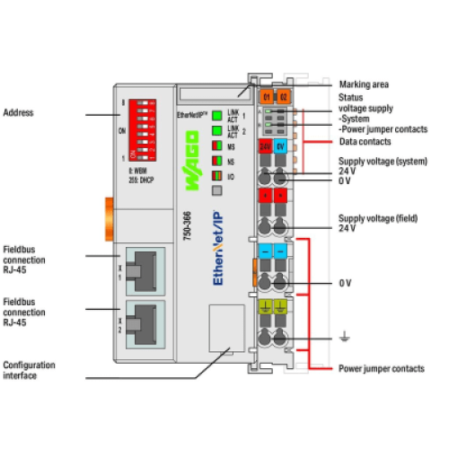 Acoplador de Bus de Campo EtherNet/IP / 4ª Generación / Protocolo DLR / 10-100 Mbit/s / 250 Módulos Máx. / IP20 / Montaje Carril DIN
