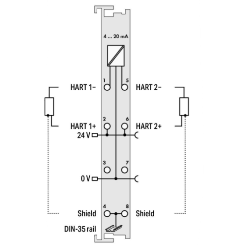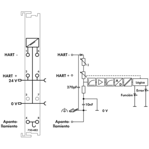 Módulo de Entrada Analógica / 2 Canales 4-20mA HART / Aislamiento Galvánico 500V / Protocolo HART / Protección Sobrecarga / Filtro Parametrizable / IP20