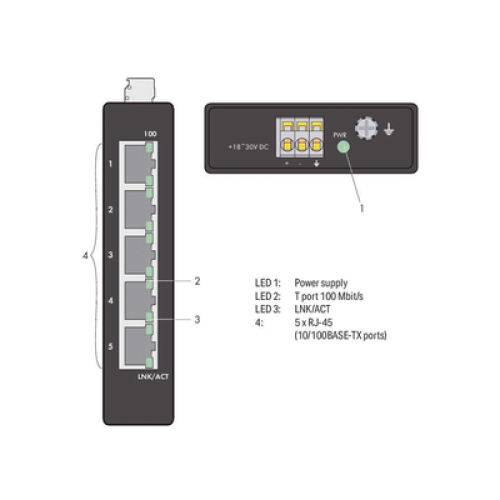Switch Industrial ECO / 5 Puertos 100Base-TX / 10/100 Mbps Auto-Negotiation / Auto-MDI/MDI-X / Alimentación 18-30 VDC / IP30 / Montaje DIN-35